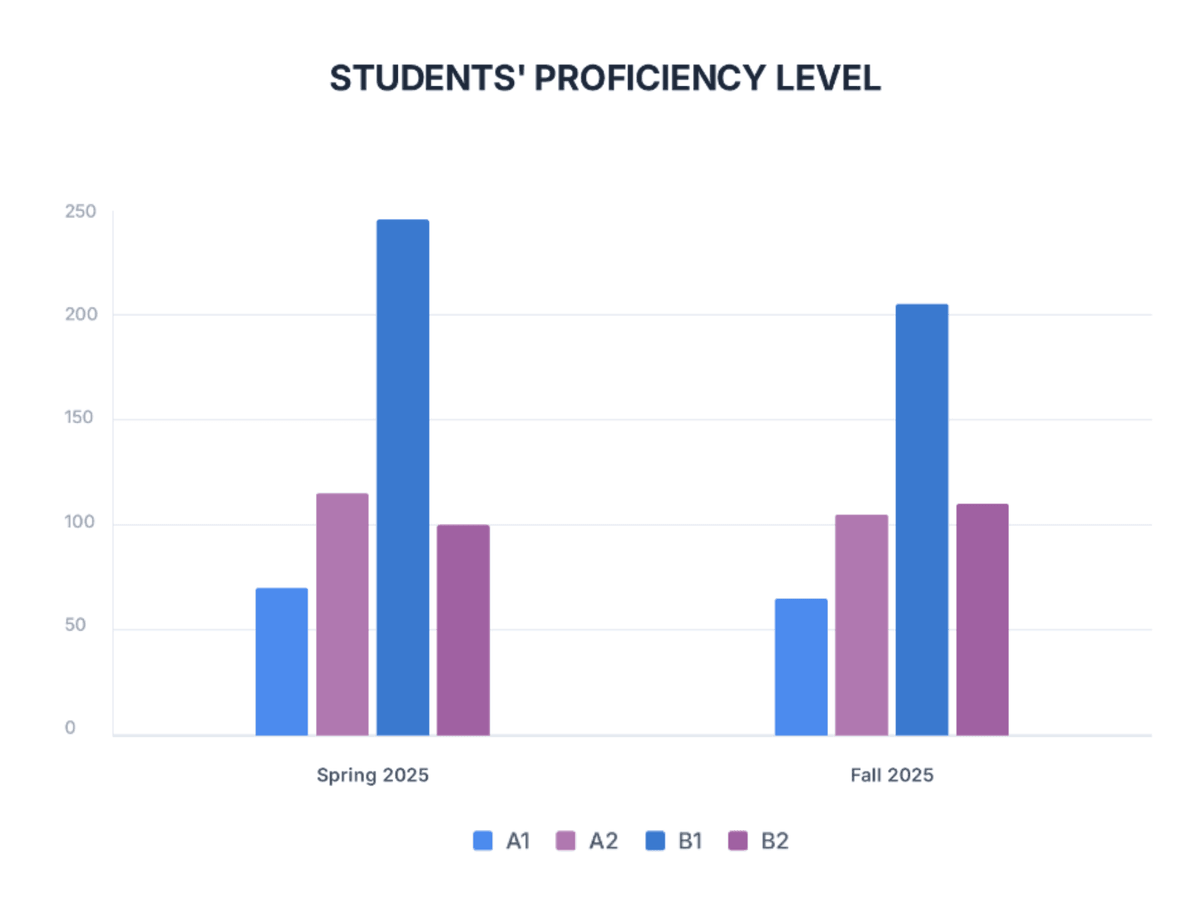 Chart 1 shows student proficiency levels in the Spring and Fall of 2025. Many new students join the program in Spring, so beginner levels are higher at that time. As these students continue learning, they move up to intermediate and upper-intermediate levels in later semesters. This causes beginner levels to decrease in the Fall, while higher levels grow, showing that students are steadily progressing through the program.