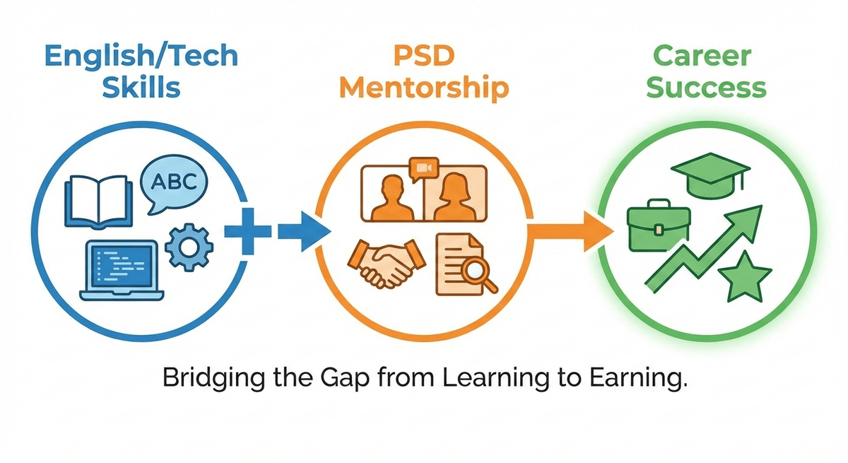 The Professional Skills Development (PSD) program is the final bridge for Paper Airplanes graduates, turning English and tech expertise into scholarships, internships, and full-time jobs.